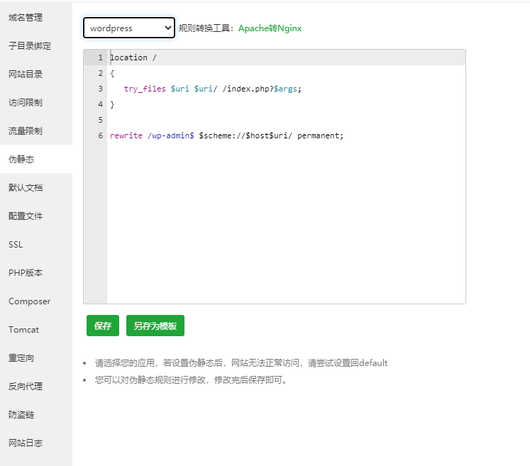 最终在宝塔面板下的网站设置页面才解决问题,点击网站设置,伪静态选择wordpress。